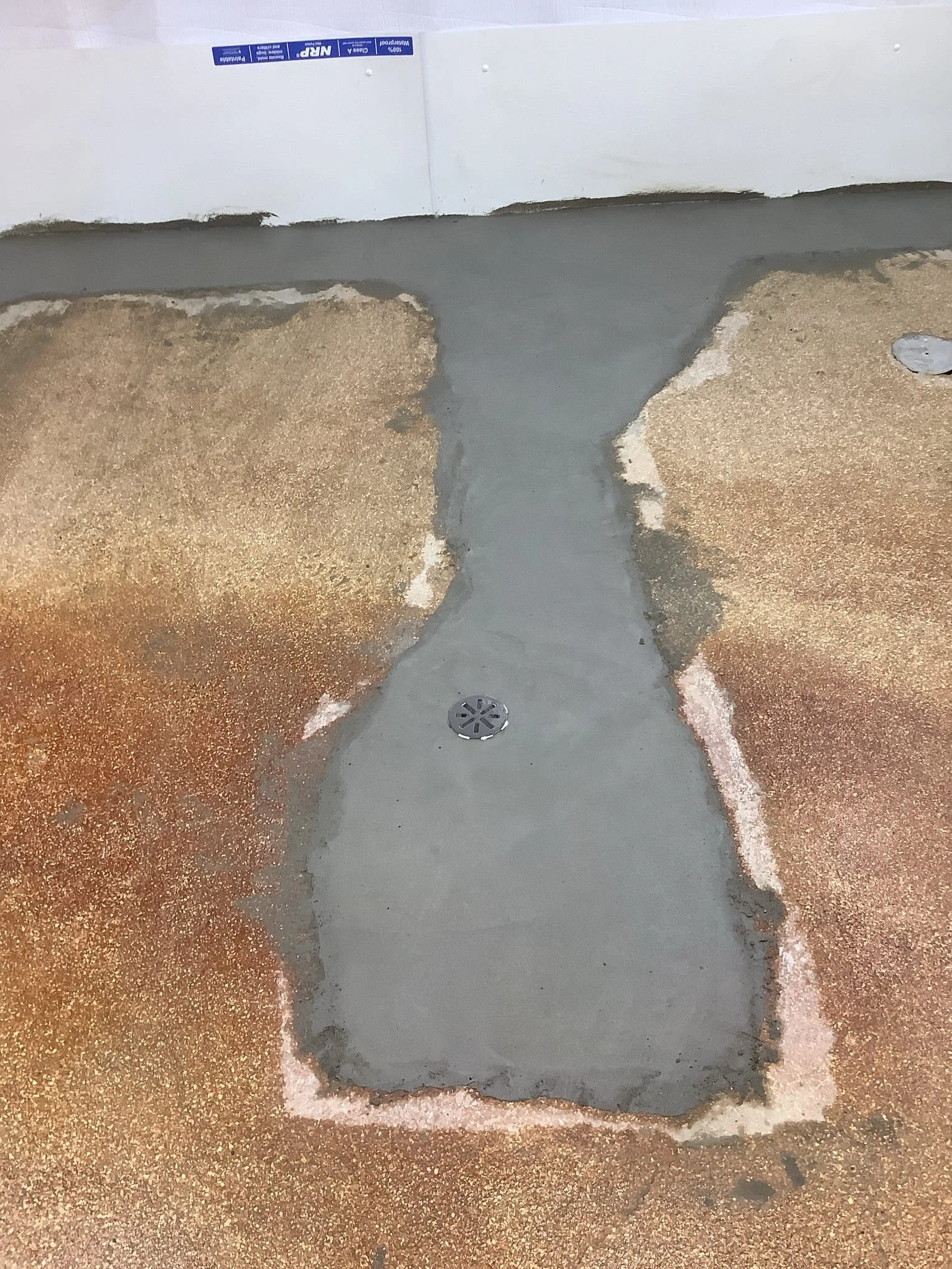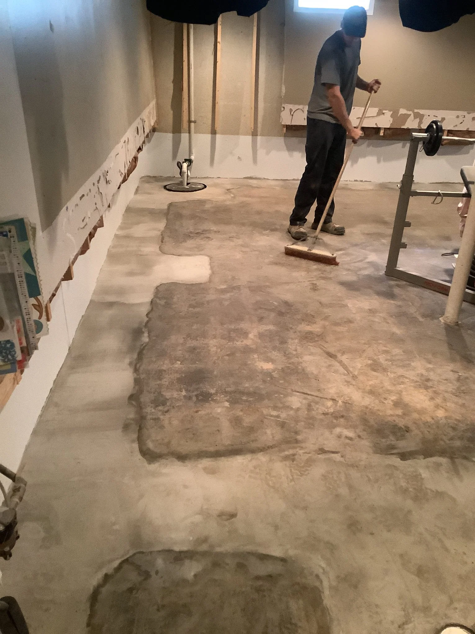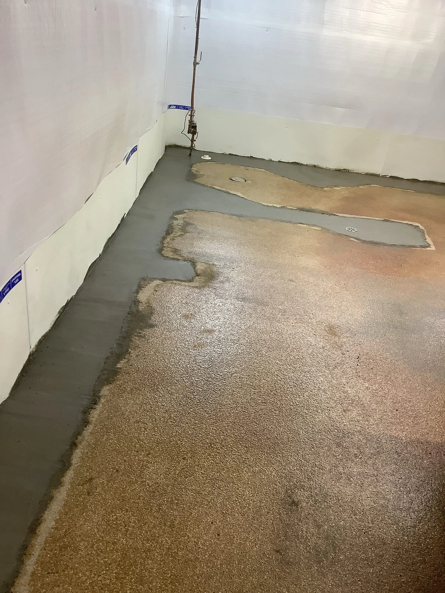 The finished floor is smooth and level, with all drainage hidden beneath the concrete. This new custom waterproofing system now directs water efficiently to the sump pump, eliminating seepage and standing water.