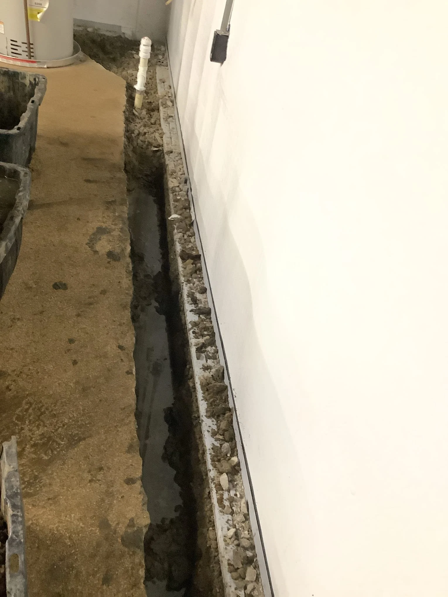 Our crew carefully broke out the concrete along the existing channel, removed the failing drain system, and installed a new PVC drain tile system with proper slope and tie-ins. The new layout was designed to connect directly to the sump basin and provide full perimeter coverage.