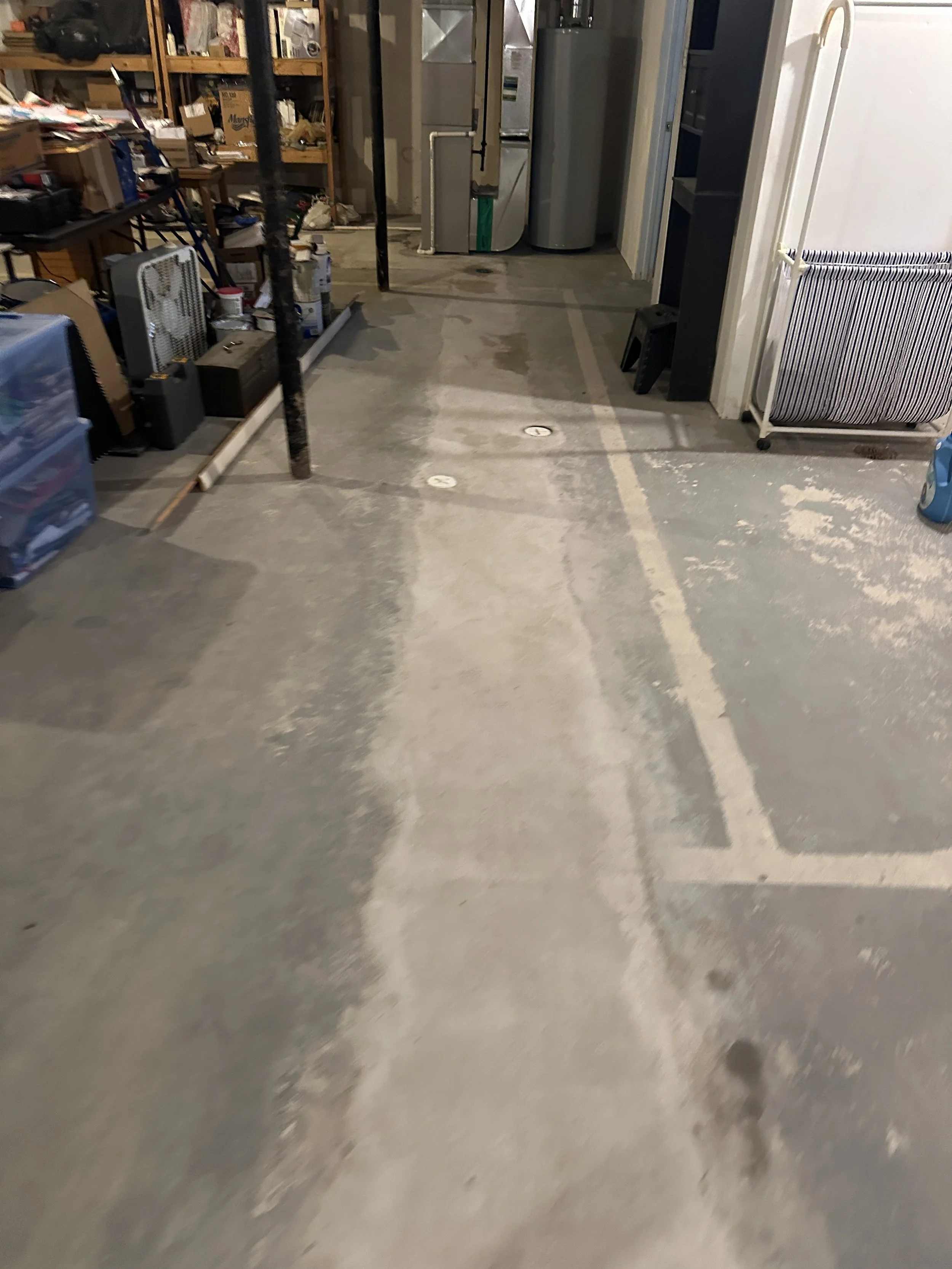 This basement was experiencing water infiltration along the foundation wall during heavy rains, resulting in standing water and staining on the concrete floor. Our inspection revealed that hydrostatic pressure was forcing groundwater through the cove joint, where the wall meets the floor.